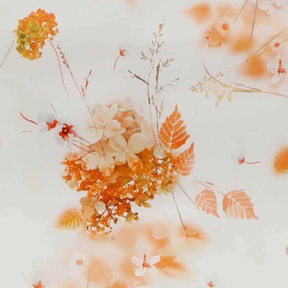 Erleben Sie die idyllische Natur mit unserer charmanten Bettwäsche, kunstvoll verziert mit eleganten orangefarbenen Blumenbouquets auf einem sanft weissen Hintergrund.