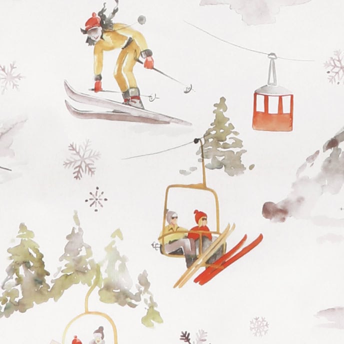 Die Bettwäsche Winterplausch bringt die fröhliche Atmosphäre eines sonnigen Skitags direkt in Ihr Schlafzimmer. Das liebevoll gestaltete Muster zeigt Wintersportler auf der Piste, Gondeln, verschneite Tannen und feine Schneeflocken – eingefangen in sanften Aquarellfarben. Diese detailreiche Gestaltung verleiht der Garnitur eine warme, nostalgische Ausstrahlung und sorgt gleichzeitig für frische Leichtigkeit.