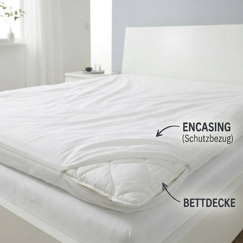 Ein Encasing schützt nicht mit einer dicken Beschichtung, sondern mit einem besonders dichten Gewebe. Die Bettdecke wird vollständig umhüllt. Dadurch wird der Austausch von Allergenen nach aussen deutlich reduziert, während Luft und Schlafkomfort erhalten bleiben.