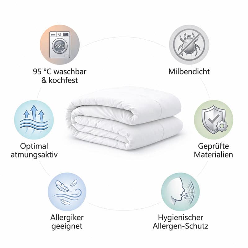 Viele Allergiker denken zuerst an Kissen oder Matratze. Die Bettdecke wird oft unterschätzt. Dabei haben Sie jede Nacht über viele Stunden direkten Kontakt mit dem Duvet. Ein milbendichter Bettdeckenbezug kann helfen, die Belastung im gesamten Schlafbereich weiter zu senken.